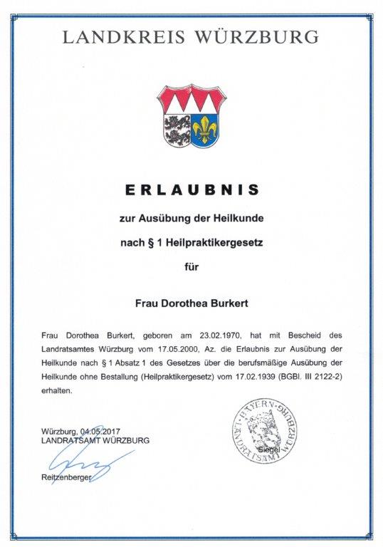 Heilpraktiker (Berufsbezeichnung verliehen in Deutschland) mit Erlaubnis zur Ausübung der Heilkunde ohne Bestallung gemäß § 1 Abs 1 des Gesetzes über die berufsmäßige Ausübung der Heilkunde (Heilpraktikergesetz) vom 17.02.1939, erteilt durch das Gesundheitsamt Würzburg vom 17.05.2000.